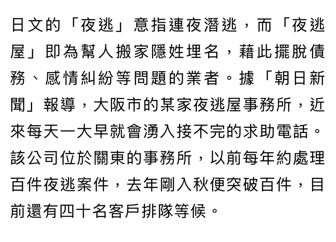 夜逃屋这个行业中,不仅有善于提出“完善出逃计划”的隐匿专家,还能协助出逃者搬运行李、提供交通运输服务、办理新的手机号码,甚至还可以提供过渡期的安全躲藏地点……诸多服务,不可谓不完善。