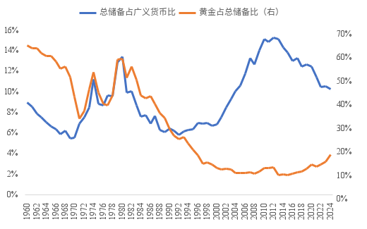 如果将黄金储备占广义货币的比重拆分为央行总储备占广义货币的比重和黄金储备占央行总储备的比重,可以看到央行总储备占广义货币的比重总体并未明显降低,主要原因还是黄金占央行储备的比重低。1964年黄金占央行储备的59%,而2000-2019年仅有10%左右,2020年以来占比回升,2024年为17%,还是远低于60年前的水平。