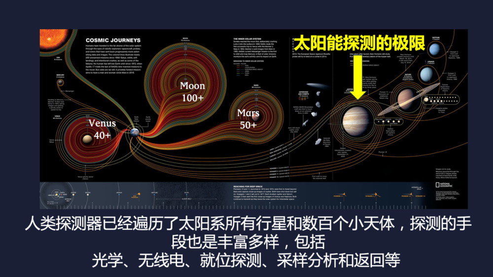 大家可以看到这张图上密密麻麻的这些探测任务,绝大多数都集中在月球、金星和火星,这也是内太阳系行星距离我们较近的。比较远的土星、木星、天王星、海王星,这是外太阳系行星很远。在探测的过程中飞行器得有能源,比木星更远的地方,由于距离太阳太远了,太阳能的效能是不够的,所以说太阳能能够到达的极限就是木星,当然更远的地方就要用其他的核动力了。所以木星是一个深空探测非常关键的技术挑战。