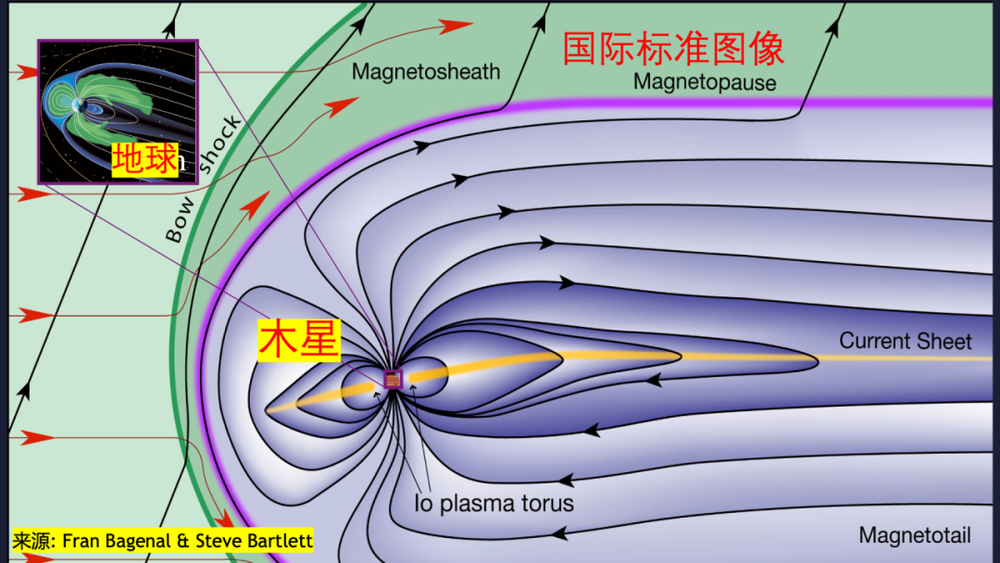 我们地球的磁场,我们有大量的数据,我们已经获得了认识,所以我们就想木星跟地球长得差不多,无非就是磁场强一点,就把它放大了,就是一个偶极磁场,面对太阳的这边被太阳压着,它就变得很小,夜侧那边拉伸变得很大。然后两极靠近磁轴的地方,是连着太阳风里面的,这么一个磁场的结构,我们类似的研究方法很标准,这是国际标准图像。从地球上运用到水星上,运用到土星上,天王星、海王星都是这样的,只要你有偶极磁场跟太阳风相互作用都是这样的。