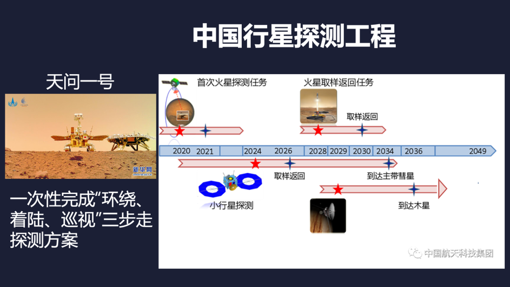 在此之后我们还部署了天问二号,天问二号去到小行星取样返回,并且要前往主带彗星;天问三号去火星采样返回,天问四号就是前往木星。天问二号是今年五月份已经成功的实施了,天问三号、天问四号、即将在2030年前后实施,所以我们接下来有一系列的行星探测任务。