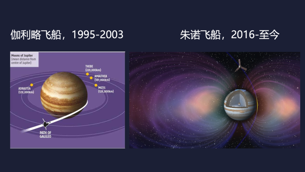 但是很遗憾在木星,我们没有这种机会,太贵了。迄今为止我们就两次专门的探测,一次是伽利略飞船,1995年到2003年。一次是朱诺飞船,2016年到现在,没有交集,所以我们是孤零零的两个飞船,在浩瀚的木星空间环境中探测,企图来理解整个空间环境长什么样,可想而知,难度是很大的。