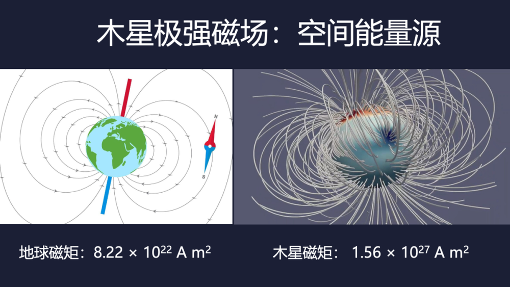 我们地球跟木星是类似的,也是有偶极磁场,所以我们能用罗盘导航。木星跟地球不一样的是大家看它的磁矩,磁矩是描述一个磁场的大小,它大概要比地球大两万倍,非常巨大,带电粒子进来了以后,它就休想跑出去了,它会给它不停的加速,最后它的能量就巨高。所以我们要研究它的空间环境,理解它空间环境,首先是磁场的问题。