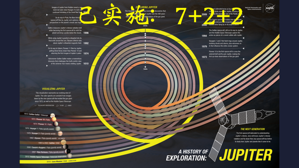 饶是如此,我们人类对于木星的探测也已经实施了11次,包括7次飞掠探测,飞掠探测的意思是我要去到其他的目标,途经木星,顺便看一下。然后还有两次是专门的探测,这两次专门探测是我们现在对木星取得了主要认识的来源,还有两次是已经发射正在前往木星的路上,所以我们已经实施的是有11次探测任务。