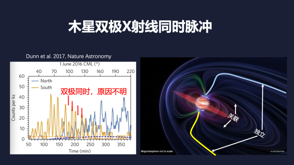 木星两极还会发出x射线,刚才我们说了图像最高纬度的地方连着磁轴的地方,它是通到太阳风里面的,对吧?北极往北通,南极往南通,所以它是相互独立的,更低一点的纬度,它磁力线是闭合的,所以说南极和北极它是关联着的。但是X射线是最高纬度,是磁磁轴附近出去的,它不应该有关联,当时我们是第一次实现了对x射线的南北极同时监测,发现了南北极居然是关联着的,这不是直接的证据说明了南北极是连着的吗?连着的你必须是闭合磁力线,不能是开放磁力线,但是怎么闭合,我是想不明白的。