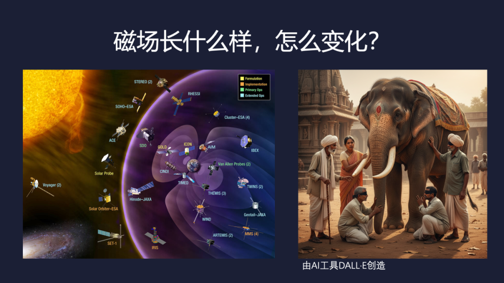 磁场怎么研究,我们地球上是怎么研究的?从太阳到地球之间,各个地方都有这些卫星在探测,类似于盲人摸象,虽然每个人只摸到一部分,但是大家把摸到的信息攒起来,就可以得到一个完整的图像,在地球上我们可以这么干。