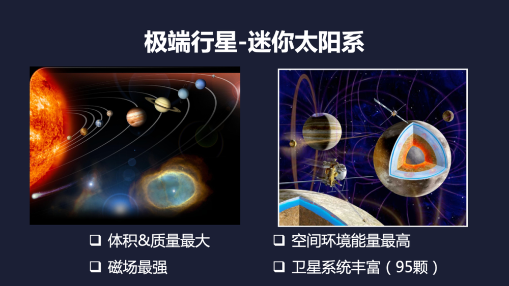 然后木星跟我们地球不一样,我们地球有几个月亮?我们就只有一个月亮,很枯燥,就是两个人在那儿玩游戏。木星有确定的是95个月球,而且这些月球有各种各样的活动,所以木星和它的月球就是一个大班级,大家一起玩,形成一个独立的王国,类似于太阳系,太阳和这些行星相互作用。所以我们也经常称木星为迷你太阳系。