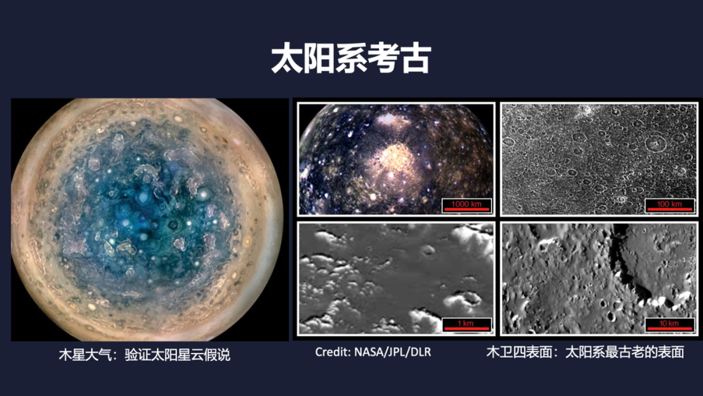我们地球找一个陨石坑很难的,因为我们地球上有一个成语叫做沧海桑田,描述的是对地面的改造,你有一个坑,将来给你改造了就没了,变成森林了,对不对?而木卫四,这个人记仇,所有的伤痕它全都记住了,它没有一点活跃,所以它不能抚平自己的伤口,实际上是因为它把历史记录都记下来了,它是太阳系最古老的表面,差不多太阳系形成之初,就是这样,然后不停的积累这些坑。所以说对木卫四的研究,对于我们理解太阳系的起源演化是一个极其重要的机遇。