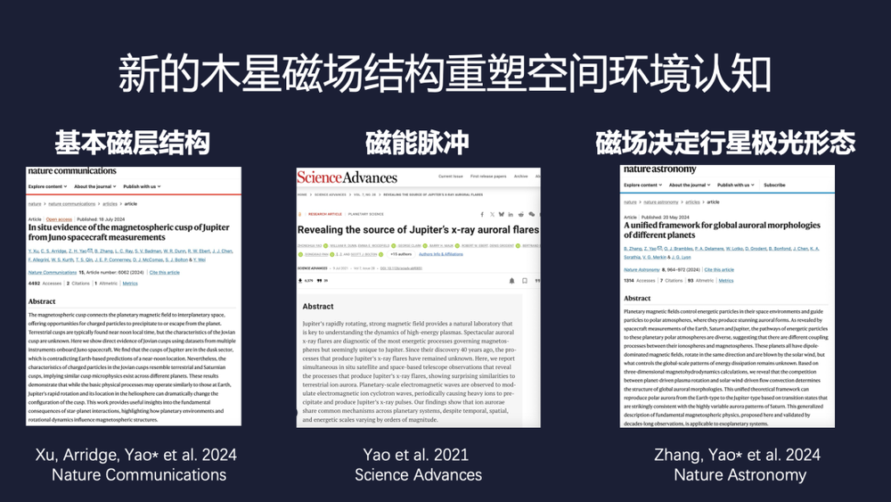 刚才我们说行星的空间环境是由磁场控制的,那么现在我们把磁力线的认知给它调了个个儿,是不是整个空间环境都变了?于是我们就开始整个要重写木星空间到底是什么?我们就进一步的开展工作。譬如说木星的基本磁层结构是什么样的?木星的磁能脉冲和x射线脉冲是什么关联?磁场是如何决定了地球、土星和木星极光的差异等等,这一系列都发表在这些国际顶级期刊上,这都是由前面一个创新的认知,衍生了一系列的研究的结果。