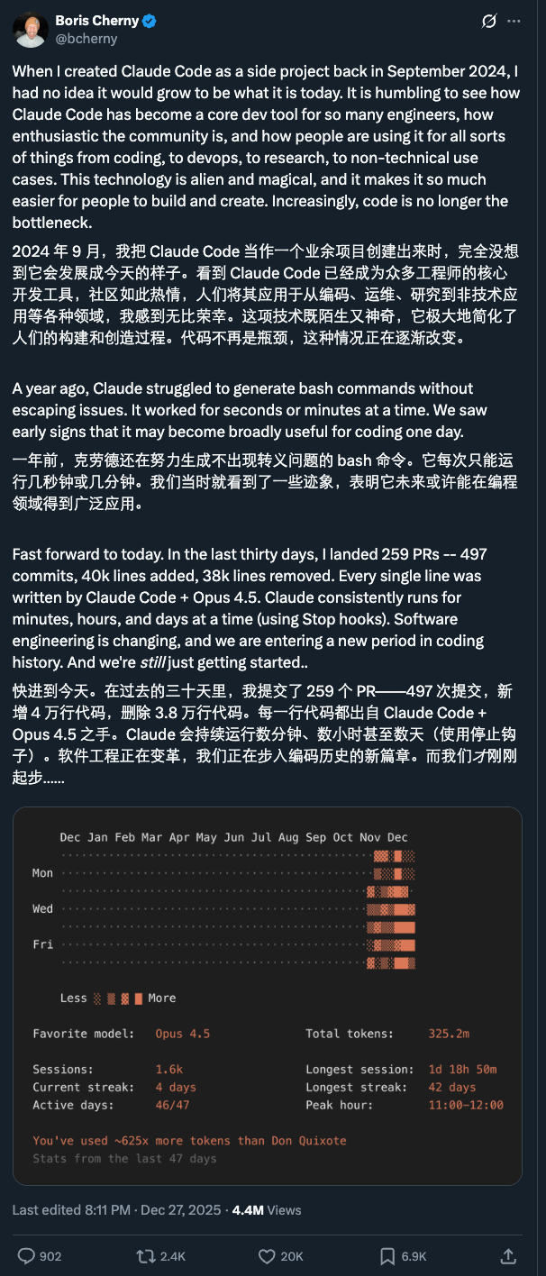 元旦假期期间,Boris Cherny还开展了一波「线上教学」,亲自示范他自己使用这个AI编程工具的工作流。感兴趣的读者可以点开我们之前的文章作为参考:《500万人在线围观,Claude Code创建者的13条独家实战秘籍爆火》。