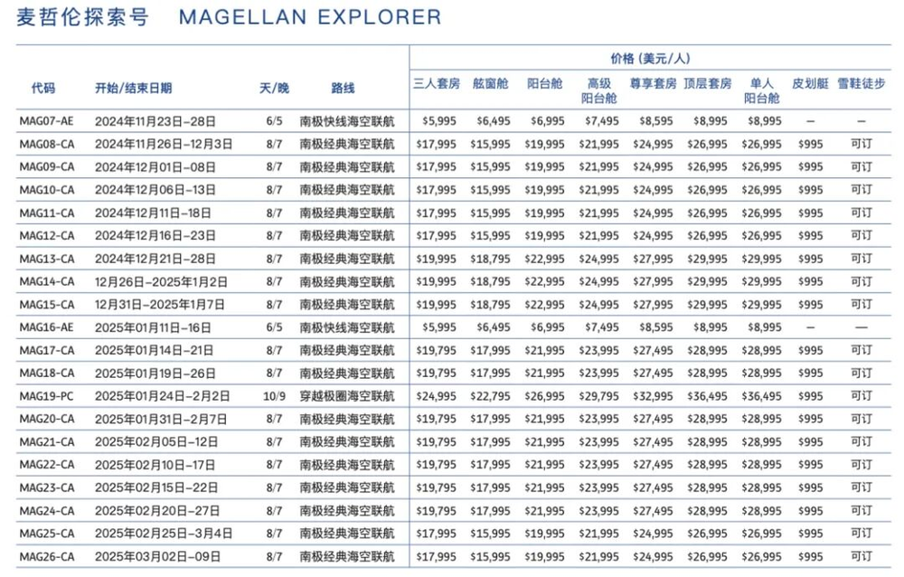 Antarctica21旗下麦哲伦探索号去年的价格表,可以参考一下