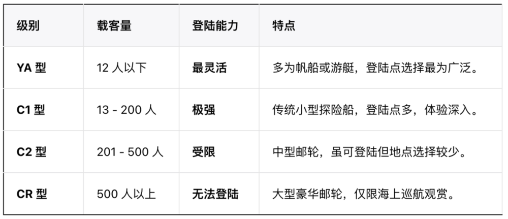 在南极旅游中,船只的载客量是一个非常关键的因素,因为它直接影响了游客的旅行体验。IAATO将运营南极旅游线路的游轮分为四种级别,分别是: