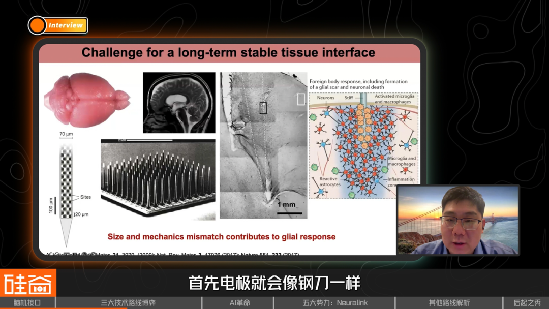 大脑,特别是一个活体的大脑,是个非常柔软的组织,就像个豆腐一样。但是所有的金属或者是硅基的探针都非常坚硬,它就像一把钢刀。所以你把这个东西插进大脑,而大脑是无时无刻不在活动的。首先这个电极就会像钢刀一样,在微尺度下切割大脑,不仅造成了长时间的力学的损伤,并且会使得电极在大脑内部进行漂移。