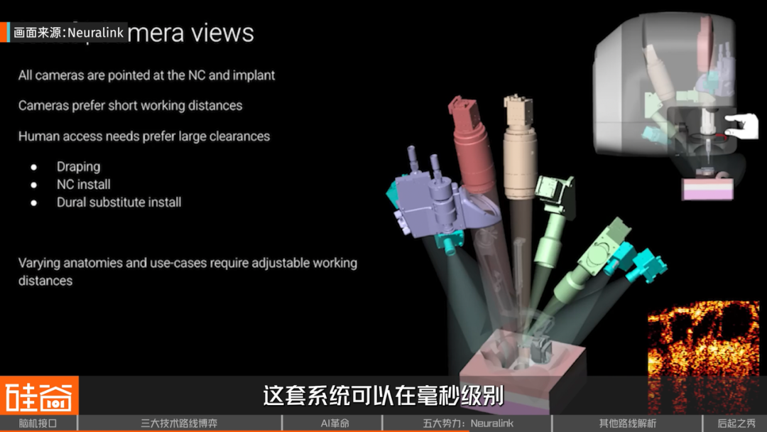 为了做到这一点,Neuralink用了6套显微镜加上OCT扫描技术,组成了一个超级精密的“眼睛”。这套系统可以在毫秒级别追踪大脑组织的运动,提前预判路径,精准避开所有血管。