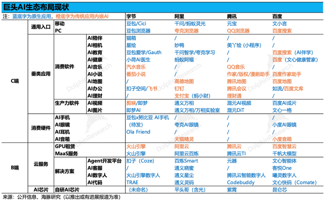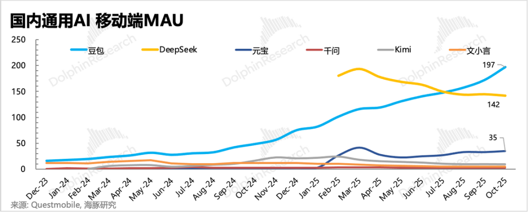 在二者短板都有明显改善,国外又有ChatGPT作为通用to C AI打样,海豚君认为一开始慢了半拍的中国互联网巨头们,到了26年一场AI APP巨头乱战已经要一触即发。