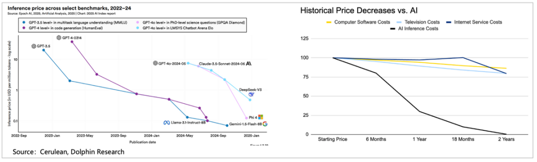 站在2025年末这个节点上,Tokens消耗仍在爆量、推理总开支仍然很高。但因为GPU迭代+算力芯片多元化,AI在推理上的单位成本这两年下降90%+。