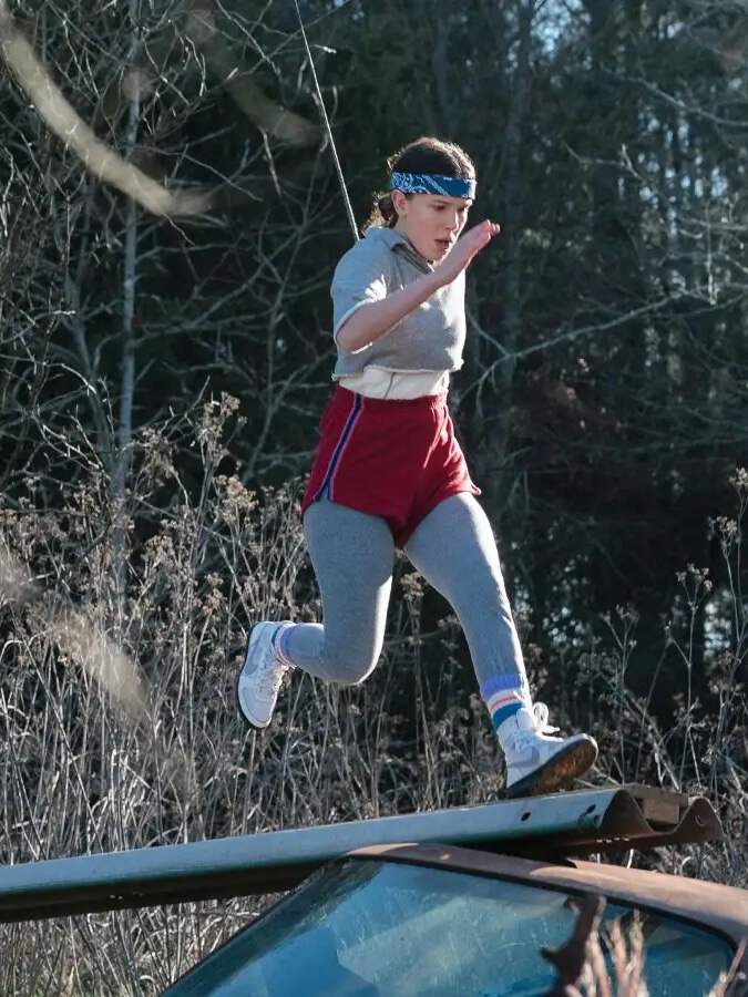在森林中进行潜伏训练时,Eleven穿着一件改短的灰色Polo外搭,里面露着白色紧身打底,下身是灰色紧身卫裤。本来成分就已经够复杂了,结果外面竟然还套了一条鲜艳的大红短裤。