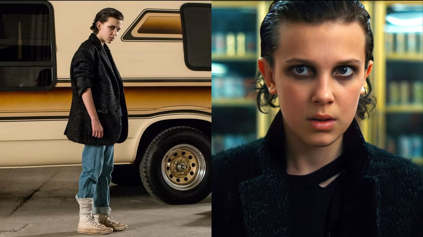 Eleven在第二季中广受好评的战斗套装也受到这方面的影响,整套都充满了经典的叛逆元素。颇具代表性的大背头和烟熏妆,Oversized的皮衣和略微松垮的牛仔裤,勾勒出一个反战反乌托邦的女战士形象。