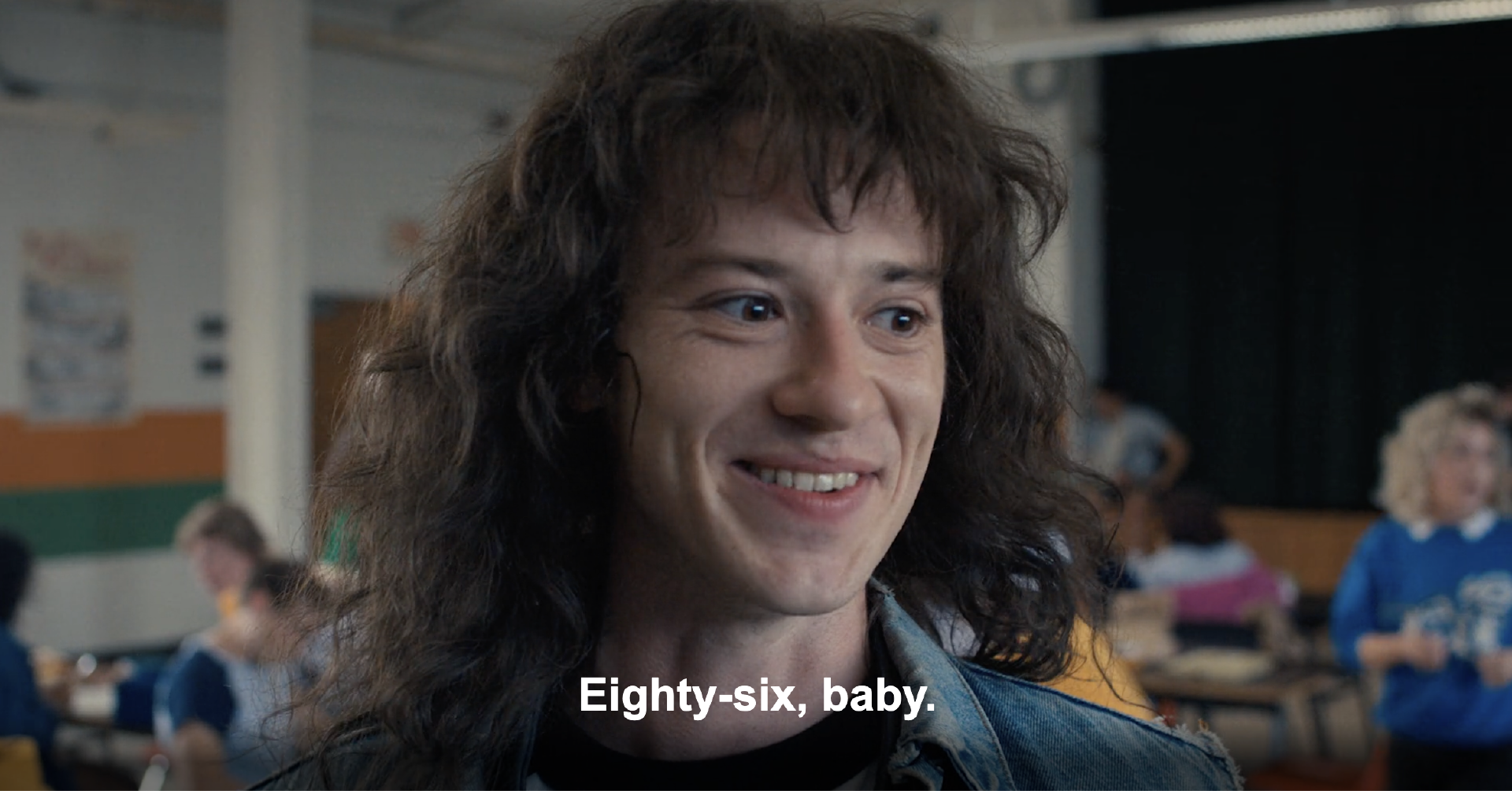 第四季的角色Eddie便是这种文化的体现。一个典型重金属爱好者的形象,他留着和ELeven非常相似的卷发,身穿俱乐部印花的插肩长袖和牛仔拼接夹克,一看就是当时校园里的刺儿头。