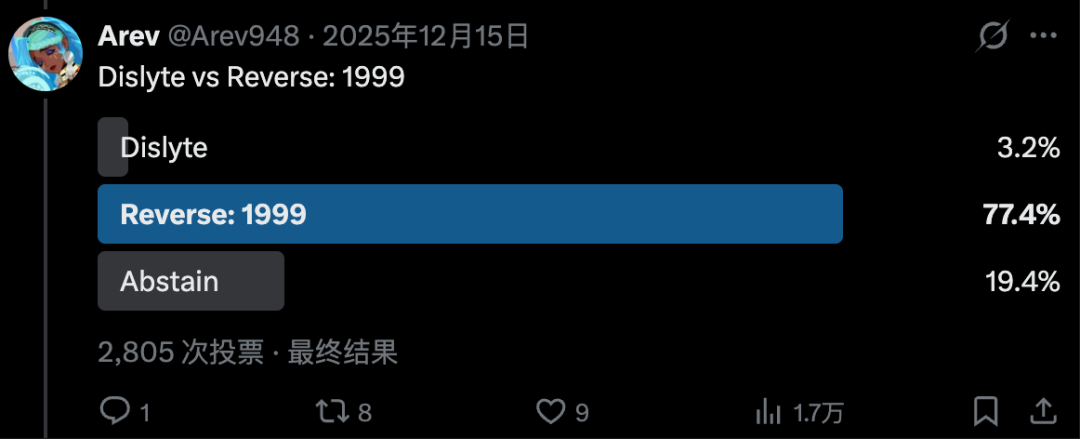 回到正题,在TGA结束几天后,Arev就搞了这一场二游剧情投票,这次一上来参与人数就翻了个倍,甚至在最后决赛时,已经有百万的浏览量,样本量也变成了好几万。而你现在明白,为什么这次热度会如此夸张了。