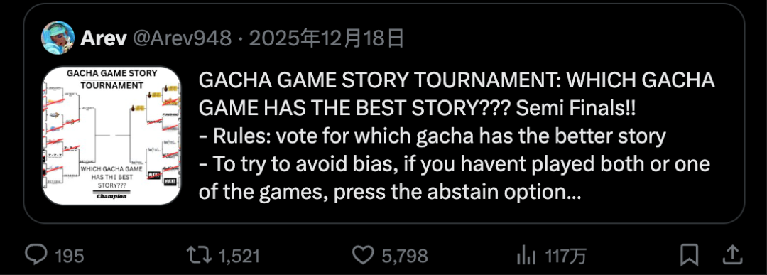 剧情这边的投票,叫做Gacha Game Story Tournament(二游剧情锦标赛),战况见文章开头那张图。