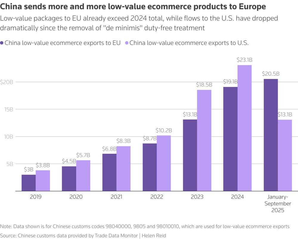 海关数据显示,2024 年,中国对欧盟的低价电商出口额为 191 亿美元,对美国出口额为 231 亿美元;但 2025 年 1~9 月,流向欧盟的出口额已经 205 亿美元,超去年全年,而对美国仅为 131 亿美元。