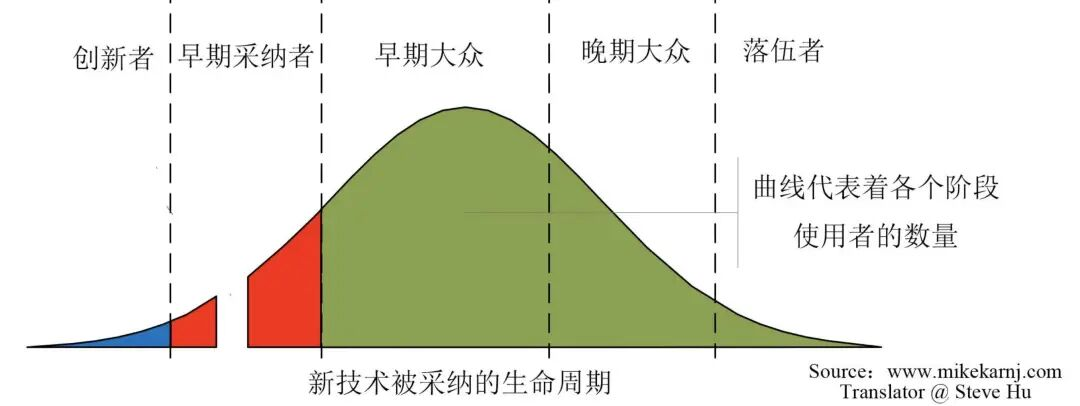 营销学上有个著名的「技术采纳生命周期」理论——任何创新产品的普及都会经历几个阶段:从热衷尝鲜的「创新者」,到具备前瞻眼光的「早期使用者」,再到务实的「晚期大众」。