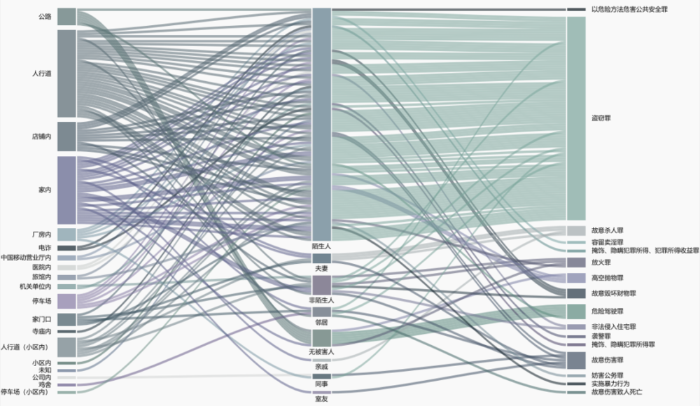 精神病人犯罪多集中在人行道、公路、店铺等公共区域,以陌生人为主,其中人行道是最常见的犯罪地点,占35.8%。案例显示,他们主要在路边、巷子等人行道偷盗电动车或以拉车门方式进行财物等方面的盗窃。虽然收录的案例显示精神病人多在公共区域实施盗窃等危害性较小的行为,但其背后直指的社区监管漏洞不容忽视。今年发生在廊坊的幼师被刺身亡案、南昌景区的女大学生被捅伤致死案,均是在公共区域、以陌生人为施害对象的恶性事件。