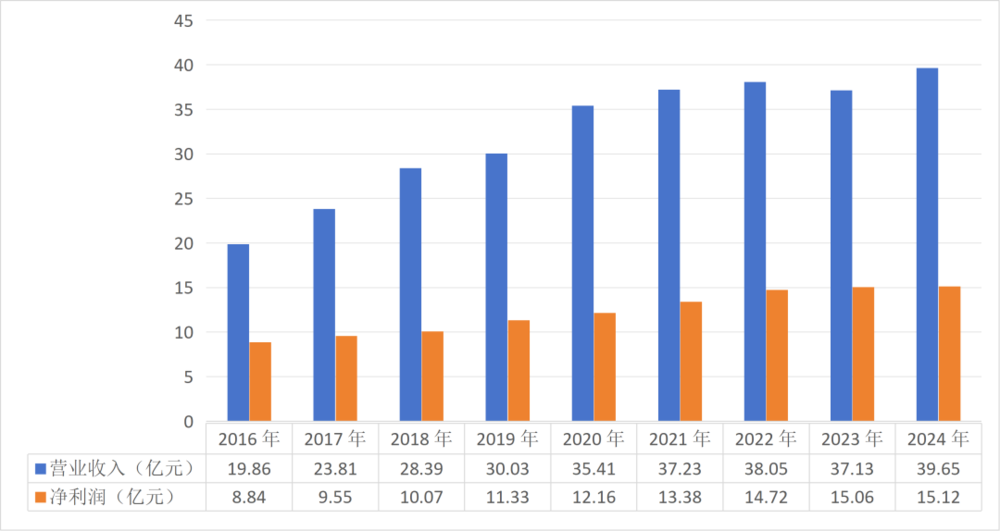 2021-2024年,该行营业收入分别为37.23亿元、38.05亿元、37.13亿元和39.65亿元;净利润分别为13.38亿元、14.72亿元、15.06亿元、15.12亿元。