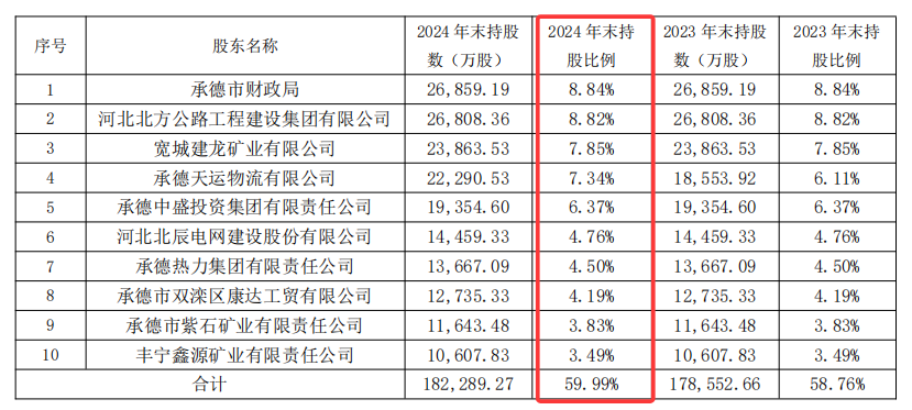 承德银行股权结构相对分散。截至2024年末,实收资本为30.39亿元,第一大股东承德市财政局持股比例仅8.84%,无实际控制人,且股东背景整体偏弱。