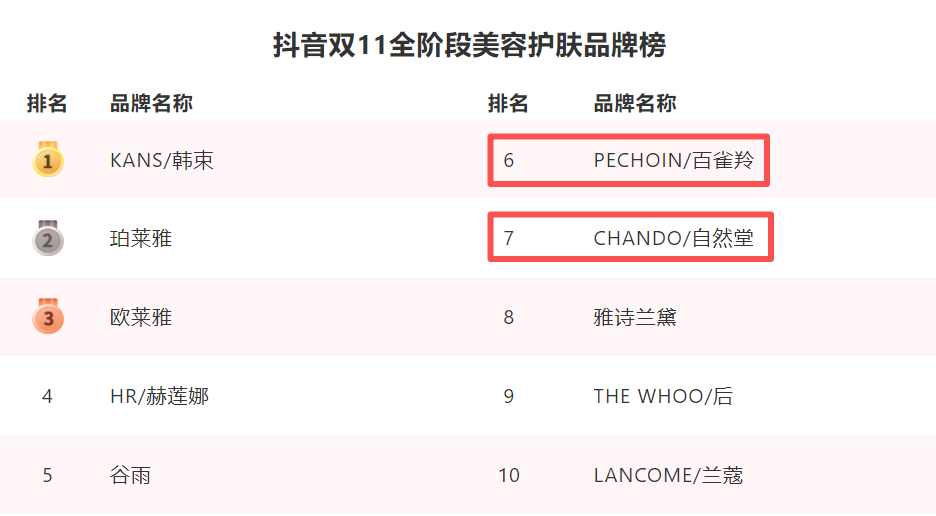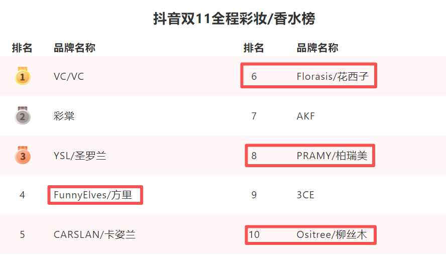 2023年,抖音双11曾单独开设“彩妆香水榜”,TOP 10中新锐国货品牌一度占据4席,花西子、彩棠、方里、柳丝木等均位列其中。但2024-2025年,平台将彩妆与护肤合并为“美妆”统计时,这些品牌便集体从总榜上消失了。