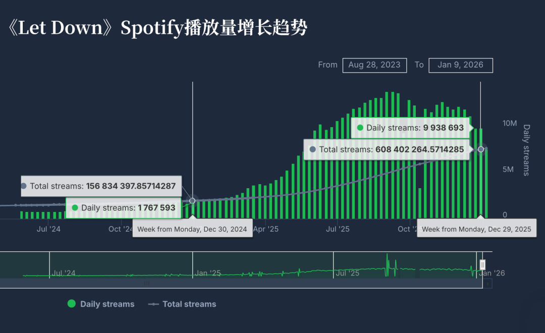 除了《Creep》,Radiohead的另一首歌《Let Down》也在2025年火了,Spotify播放量从去年年初的1.5亿飙升到年底的6亿。在TikTok的年度盘点中进入了全球年度最火歌曲前20。