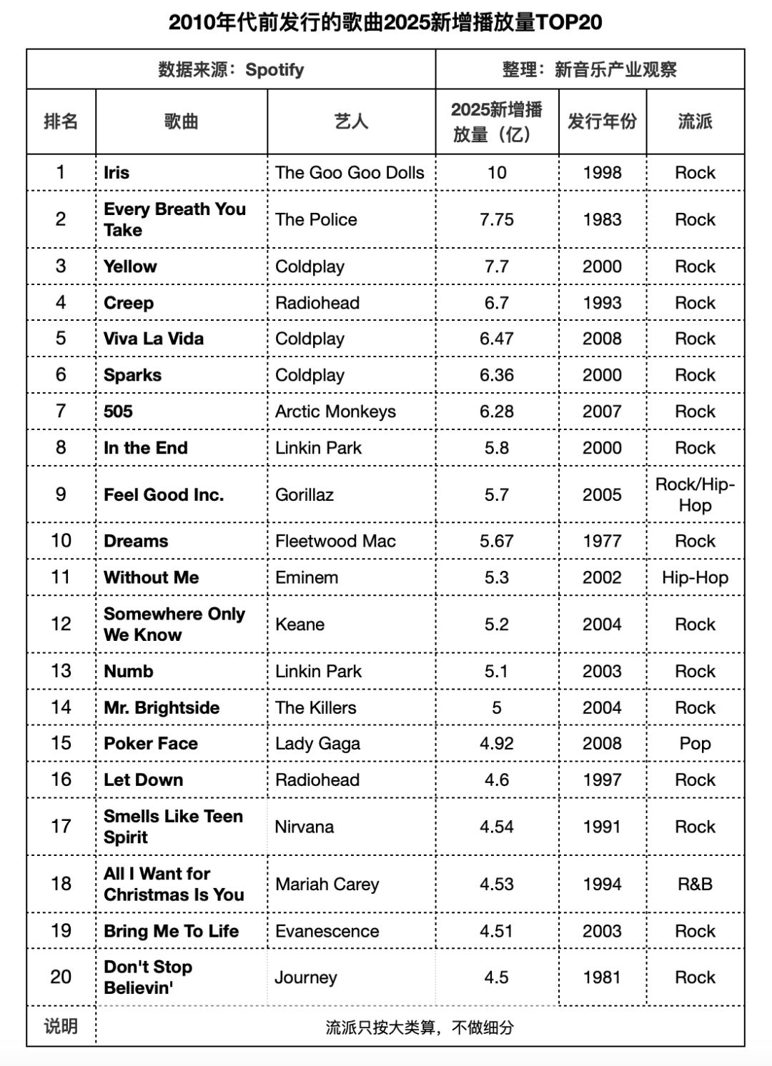 2025年火的摇滚老歌并不只有Radiohead,The Goo Goo Dolls的歌曲《Iris》,一年新增10亿播放量,名列20世纪歌曲第一位,The Police的《Every Breath You Take》,年内新增播放量也将近8亿。