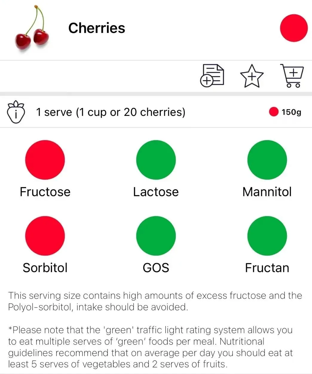 ▲对一些肠易激综合征(IBS)患者来说,一次摄入150g车厘子,其中的果糖fructose和山梨糖醇,Sorbitol可能就会让他们的肚子不舒服。图源:FODMAP APP截图。这是一个帮助管理与IBS)相关的胃肠道症状的app