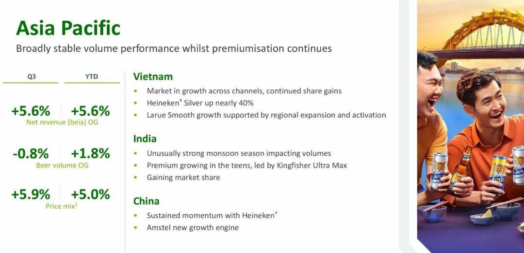 2025年第三季度的财报电话会议中,喜力管理层将全年营业利润有机增长预期下调至4%-8%区间的低端,并在本财年内第二次下调销量指引。尽管公司在非洲和亚洲市场表现尚可,但在核心的欧洲和美洲市场,销量下滑的阴霾挥之不去。