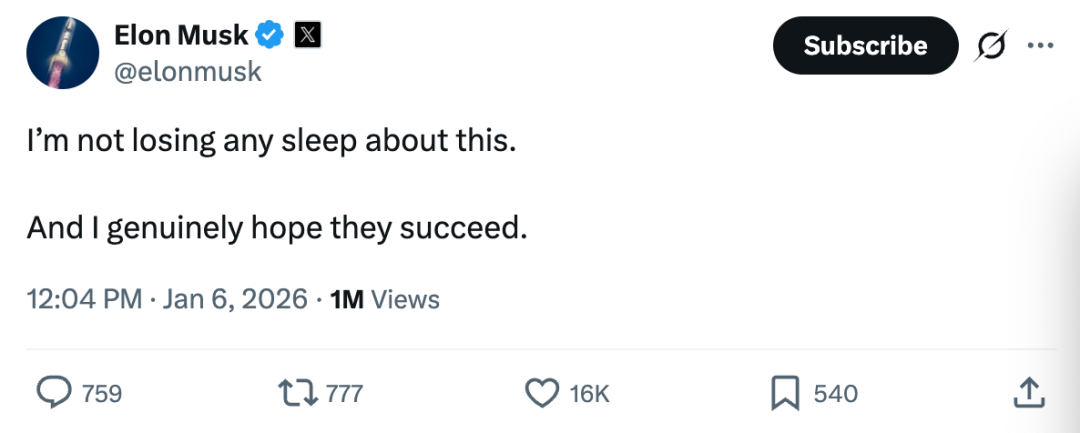 看热闹不嫌事儿大的网友第一时间@马斯克,表示马总这下要睡不着觉了。6G网速的马斯克也在第一时间回应,说自己睡眠质量还行,并“真心希望英伟达获得成功”。