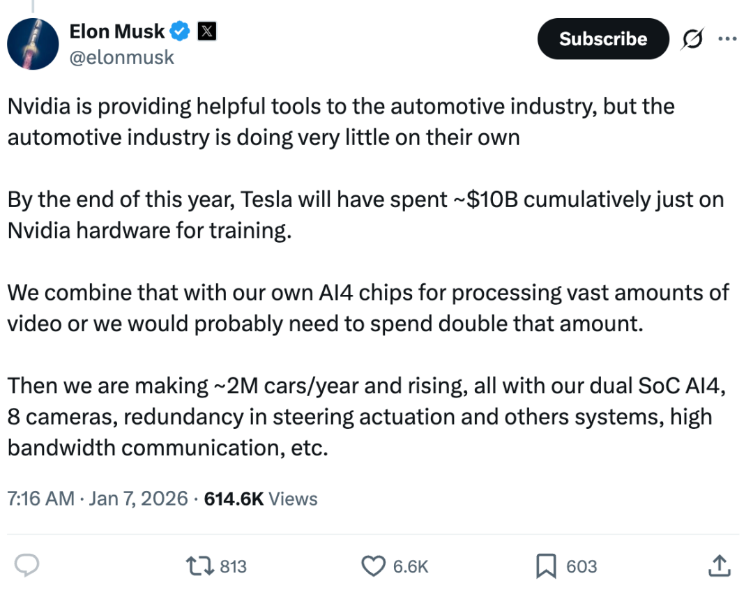 在CES展当天的媒体采访环节,黄仁勋谈到特斯拉FSD时依然是一通乱吹,“世界级标杆”、“表现完美”、“我自己都在用”赞美三连[2]。可惜马斯克并不领情,回应完自己睡眠质量的担忧后再次开炮,一边大夸特夸特斯拉的技术水平,一边嘲讽英伟达: