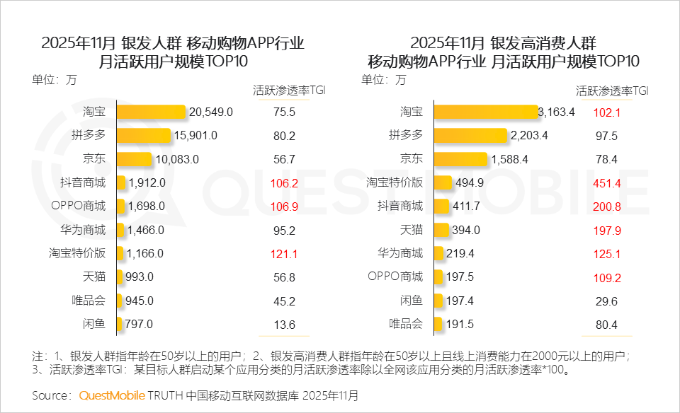 QuestMobile数据显示,银发人群和银发高消费人群在日常购买生活用品时,均偏向使用抖音商城、淘宝特价版APP。