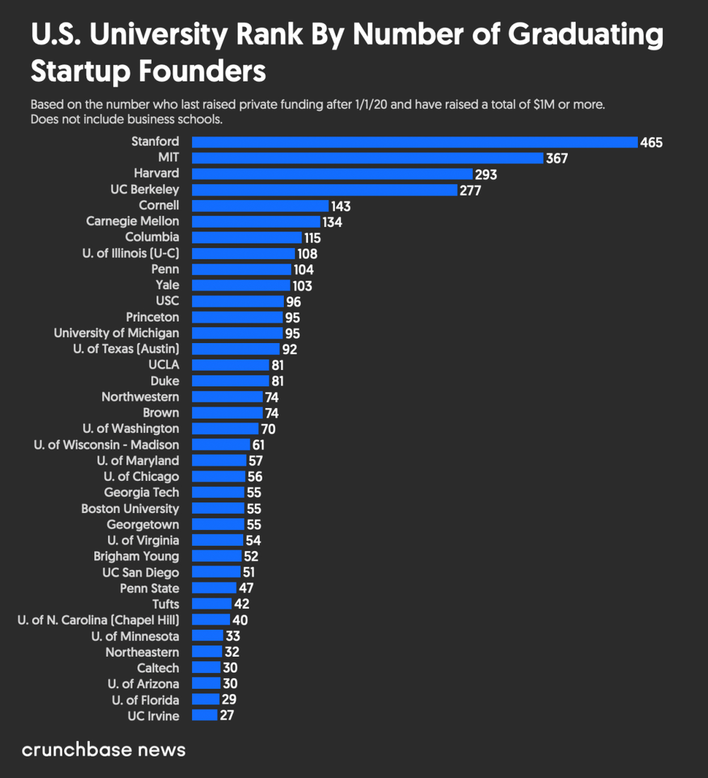 ■「开拓创新」是顶尖大学选人很重要的一点,美国融资100万美元或以上的科技创业公司的创始人大多来自顶尖大学,斯坦福「断层式」第一