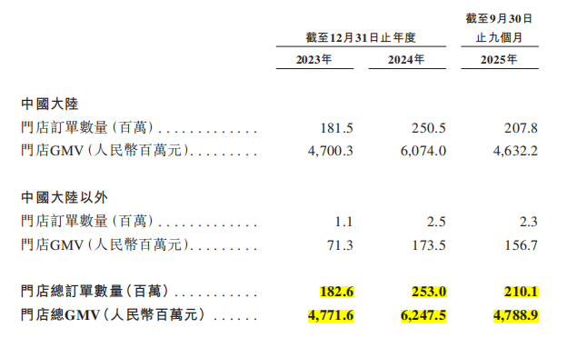 招股书显示,2023全年、2024全年、2025年前九个月袁记食品的门店总GMV分别为47.72亿元、62.48亿元、47.89亿元;门店总订单量为1.8亿单、2.5亿单、2.1亿单。