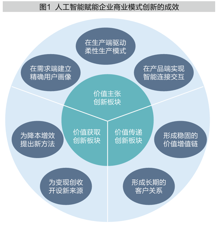 人工智能赋能企业商业模式创新的成效体现在商业模式创新的核心模块,包括价值主张、价值传递和价值获取(见图1)。