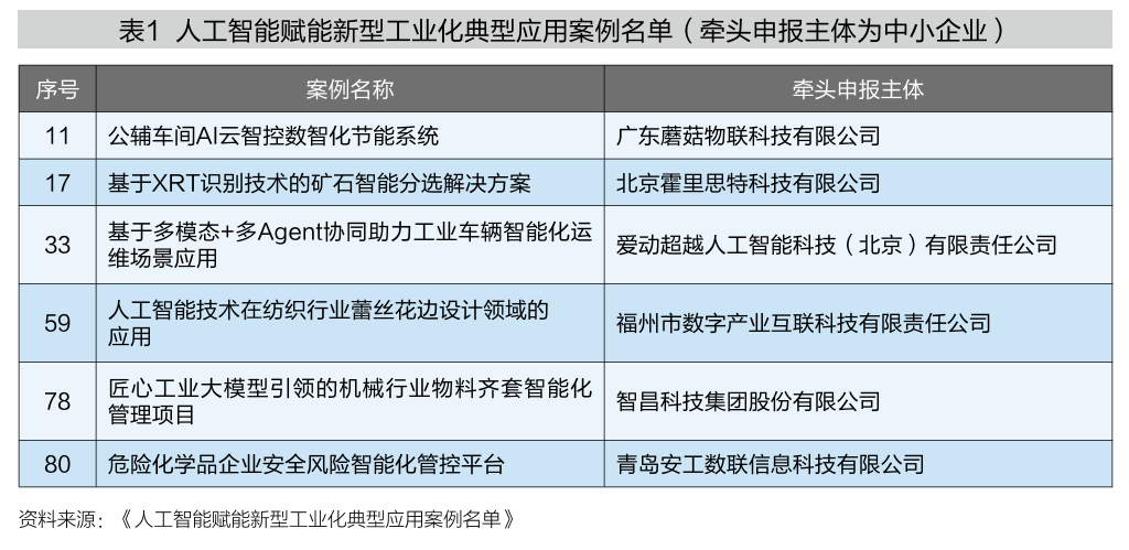 另一方面,重点行业内由人工智能赋能的企业以大型企业为主,中小企业相对有限。工业和信息化部于2024年12月31日公示《人工智能赋能新型工业化典型应用案例名单》,该名单聚焦人工智能赋能的钢铁、有色、石化、化工、建材、机械、汽车、电力装备、轻工、电子等制造业十大行业,遴选出行业应用类案例总计89例。三类企业是牵头申报的重要主体,一是能源、基建等领域的央企或国企集团及子公司,二是以宁德时代、海尔智家、京东方为代表的制造行业上市龙头企业,三是以朗坤智慧、商汤科技为代表的科技行业龙头企业。以广东蘑菇物联、北京霍里思特为代表的中小企业占比不足10%(见表1)。