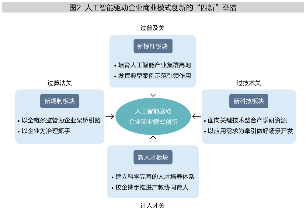 为支持我国企业攻克普及关卡、技术关卡、人才关卡和算法关卡,本文从新标杆板块、新科技板块、新人才板块和新规制板块等4个方面,提出人工智能驱动企业商业模式创新的“四新”举措(见图2)。