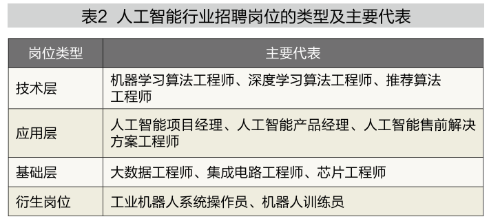 一方面,我国面向人工智能的人才市场高度供不应求,高层次人才供需严重失衡,直接影响企业的生存与发展。与人工智能直接相关的新岗位正在增加,包括技术层、应用层、基础层和衍生岗位等(见表2)。根据智联招聘相关报告,算法工程师和数据标注师在人工智能行业岗位需求占比分别为26%和23%,位列第一和第二;人工智能产品经理和工业机器人工程师的岗位需求增长率分别为323%和7%,位列第一和第九,招聘需求旺盛。但猎聘大数据研究院相关报告显示,人工智能行业整体人才紧缺指数(TSI)达到了3.24(TSI>1即表示人才供不应求),人工智能拔尖人才成为我国企业的“稀缺资源”。在学历要求方面,要求硕博学历的职位占比46.98%,算法工程师和深度学习等技术层岗位对硕博学历要求占比最高。