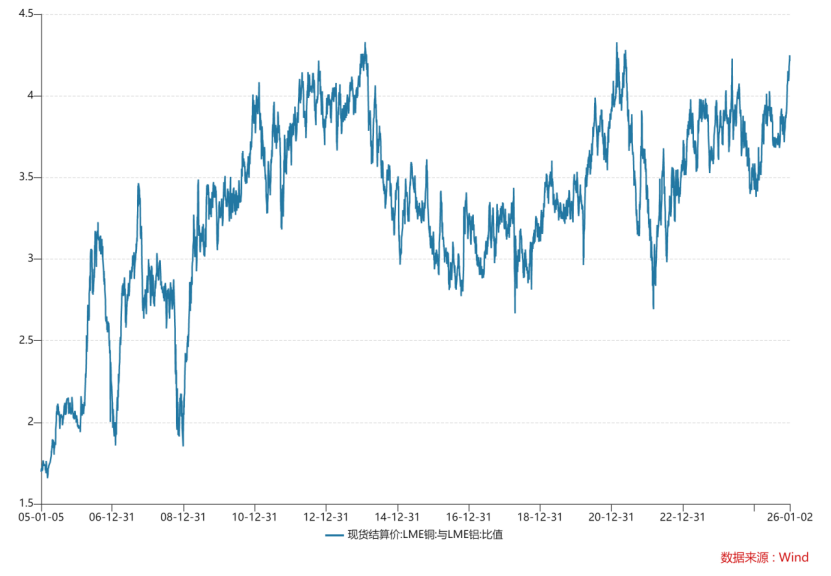 当前铜铝价格比值已处于近 20 年以来的历史高位区间,该比值自2005年 1.7倍的低点起,整体呈现震荡上行态势,截至目前已攀升至4.21倍的水平。