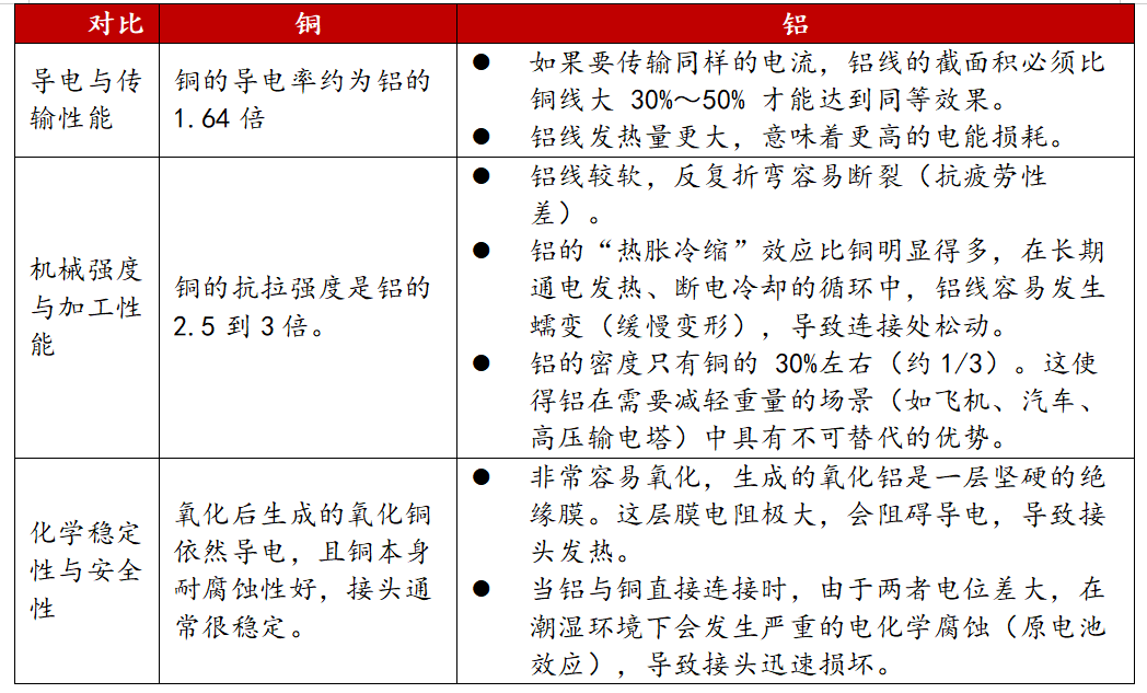 铜在导电性、耐用性、安全性等多方面具备显著优势,但铝在轻量化及性价比方面具有自身独特的优势。