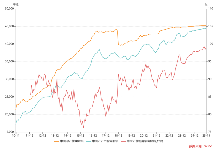 截至25年10月,我国电解铝总产能4523.2万吨,未来产能以置换为主,政策层面已锁定上限。24年以来产能利用率94.46%上升至99%左右,接近满产。