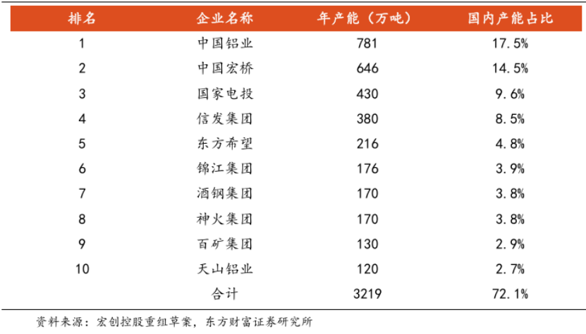 图:2024年国内前十大电解铝企业产能