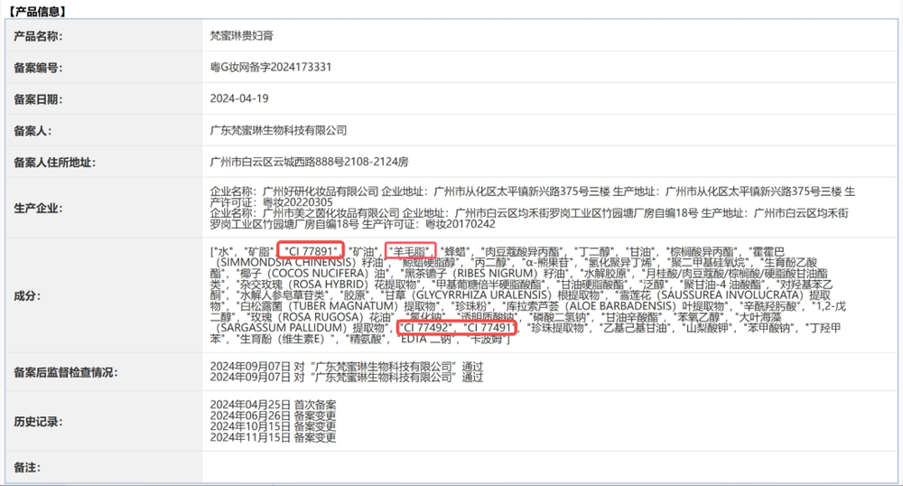 甲醛释放防腐体系一般是用在洗去式产品如洗发水、沐浴露这类产品中,长时间接触滞留的产品释放的甲醛,容易导致皮肤敏感,甚至致癌。此后,梵蜜琳贵妇膏进行了多次备案更新,目前成分表中已经去除了乙内酰脲。