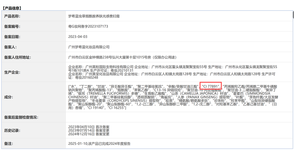 此前界面新闻就曾发布文章直指梵蜜琳贵妇膏是“素颜霜”。梵蜜琳贵妇膏的备案信息显示,CI 77891二氧化钛排在第三位,这是一种物理防晒剂、着色剂。因为白度很高,在护肤品以及粉底中常作为白色粉体调色使用。